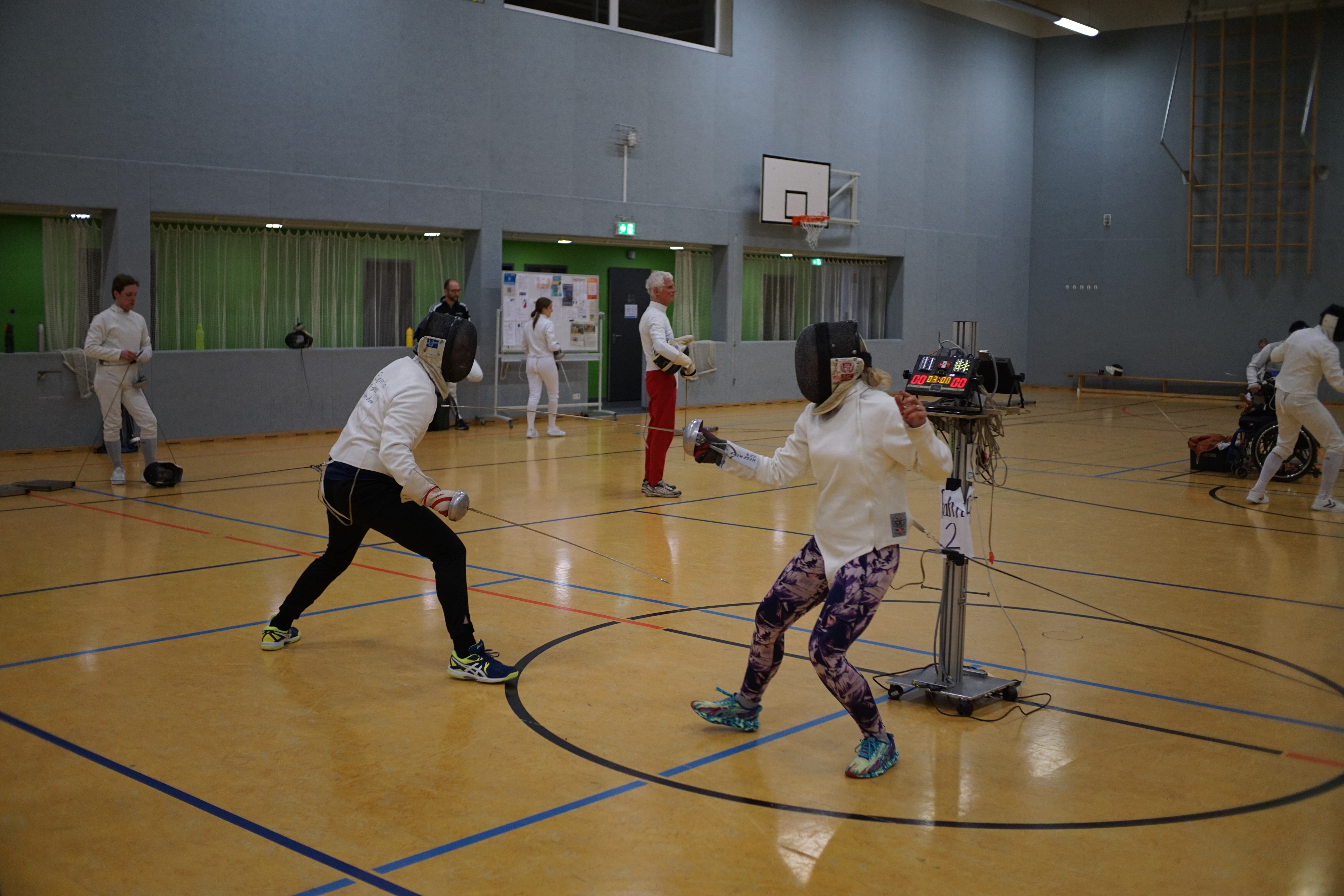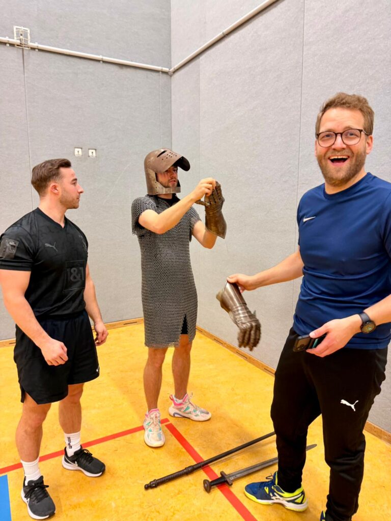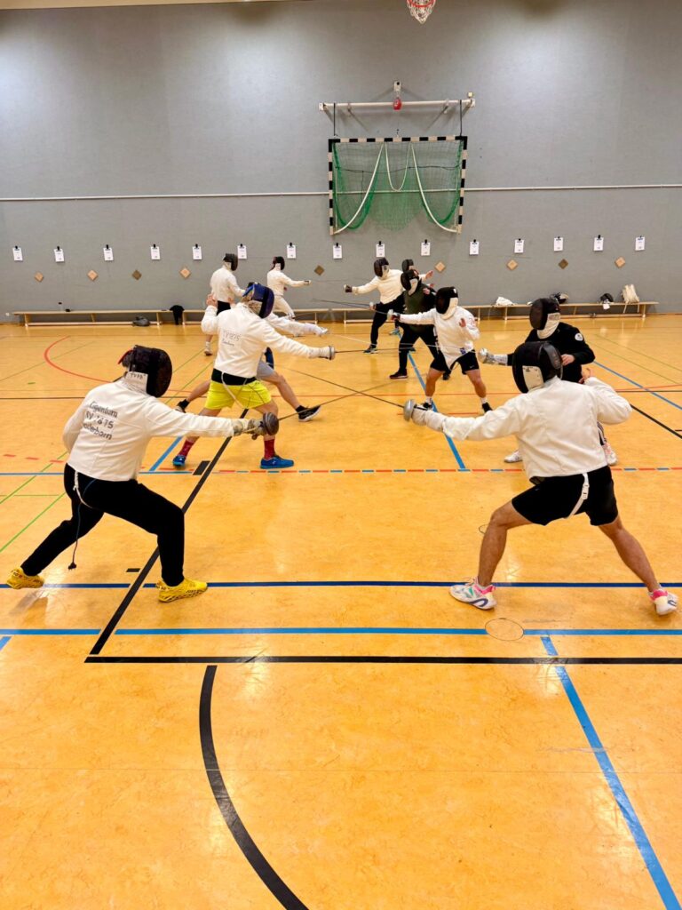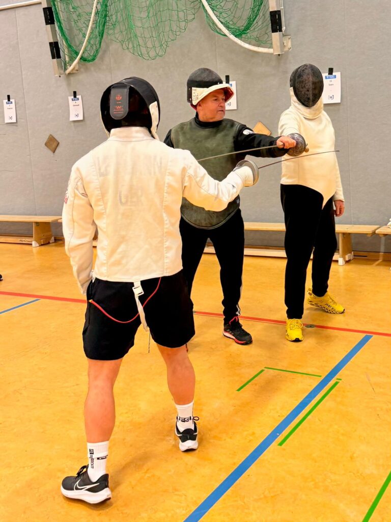 Nach einer herzlichen Begrüßung ging’s gleich los: Mit einer kurzen Einführung in die Entwicklung der Schwertkunst bis hin zum modernen Fechten – einer Sportart, die seit Jahrhunderten für Präzision, Schnelligkeit und mentale Stärke. Bevor die Klingen gekreuzt wurden, stand ein gemeinsames Warm-Up auf dem Programm: Lockeres Aufwärmen, koordinative Übungen und die ersten Schritte im Fecht-Schritt halfen allen, sich schnell in die Sportart einzufinden. Danach ging es praxisnah weiter: Haltung, Abstandsspiel, Angriffe und Reaktionen wurden gemeinsam geübt – perfekt für Einsteiger und alle, die einfach Spaß haben wollten.